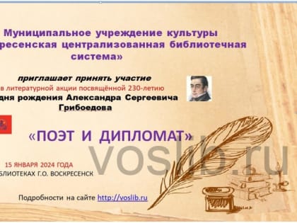 ГЕРОЙ НЕ СВОЕГО ВРЕМЕНИ 15 января в рамках окружной литературной акции «Поэт и Дипломат» сотрудники библиотеки с.Федино проведи для учащихся 10 класса МОУ «СОШ Горизонт» литературный час,
