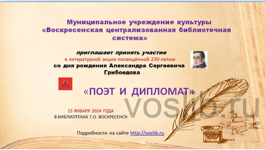 15 января в рамках окружной литературной акции «Поэт и Дипломат» сотрудники библиотеки с.Федино проведи для учащихся 10 класса МОУ «СОШ Горизонт» литературный час, посвященный 230-летию со дня рождения русского писателя Александра Сергеевича Грибоедова.