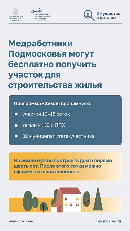 Комитет по имущественным отношениям, природопользованию и экологии Московской области информирует о практике выделения земельных участков медицинским работникам на территории Московской области.