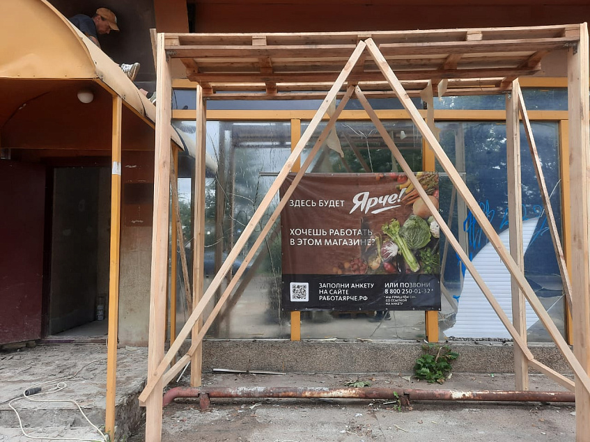 Сейчас на первом этаже всё того же дома, по соседству с питейной точкой, рабочие ремонтируют помещение. С их слов, ремонт завершится примерно через две недели, после чего здесь откроют продуктовый магазин. В подтверждение слов ремонтников в витрине, среди деревянных лесов уже красуется плакат будущей торговой точки.