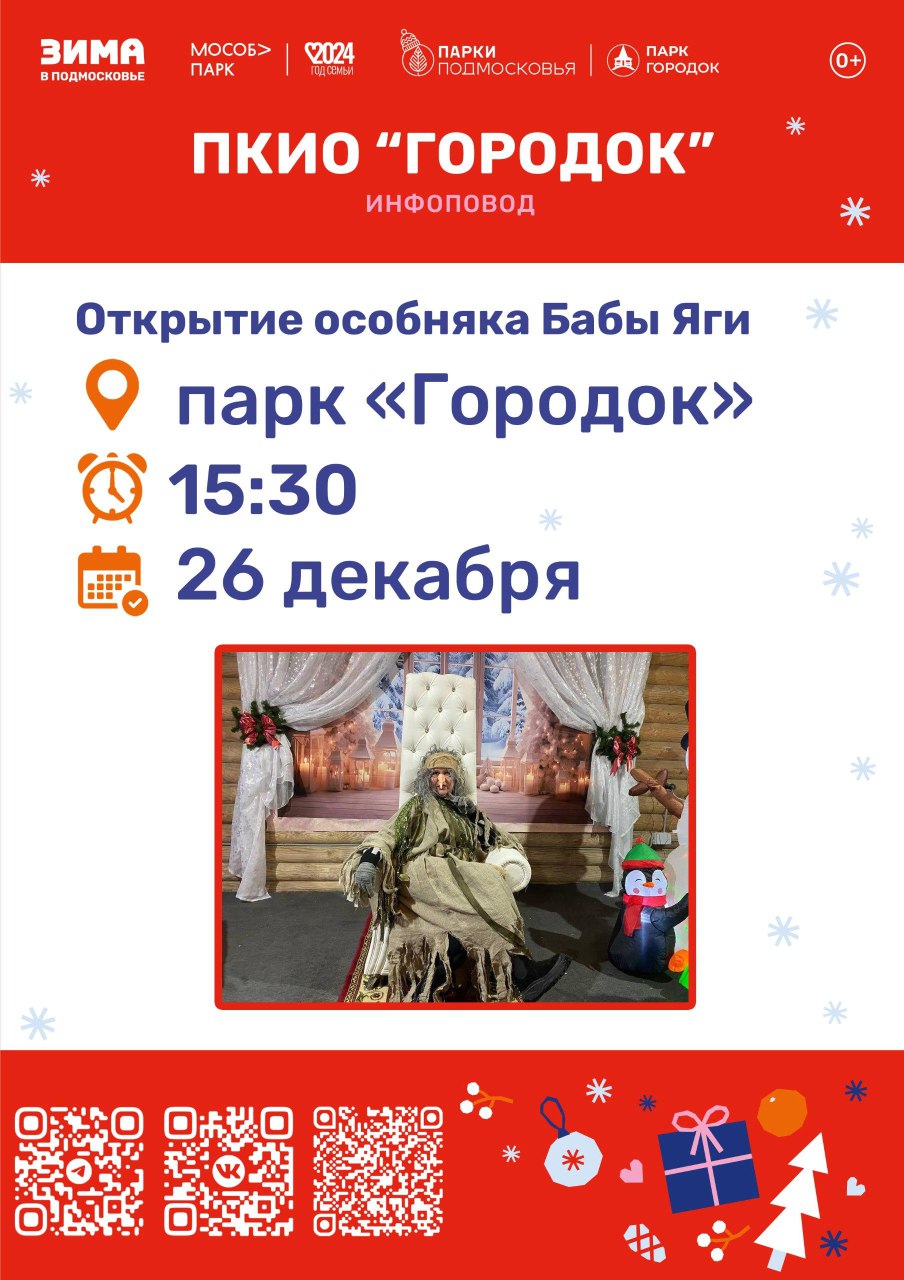 Открытие особняка Бабы-Яги состоится 26 декабря в 15.30. Участников мероприятия ждут: анимационная игровая программа, мастер-класс «Новогодняя игрушка».