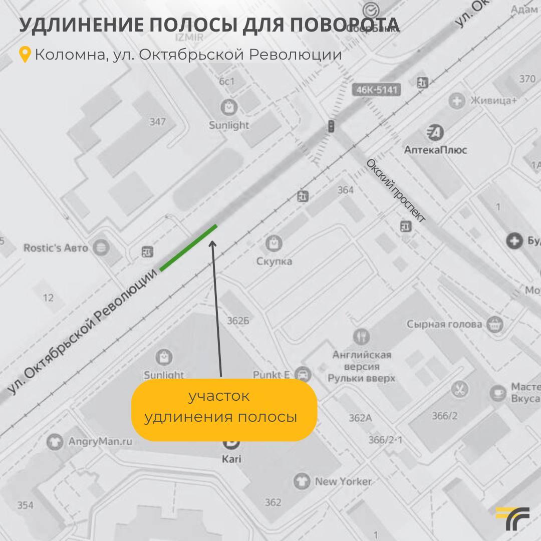 В Коломне на улице Октябрьской, на перекрестке с улицей Революции, начались работы по расширению автомобильной полосы для правого поворота на Окский проспект. Это решение принято с целью предотвращения заторов, которые часто возникают на данном участке дороги.