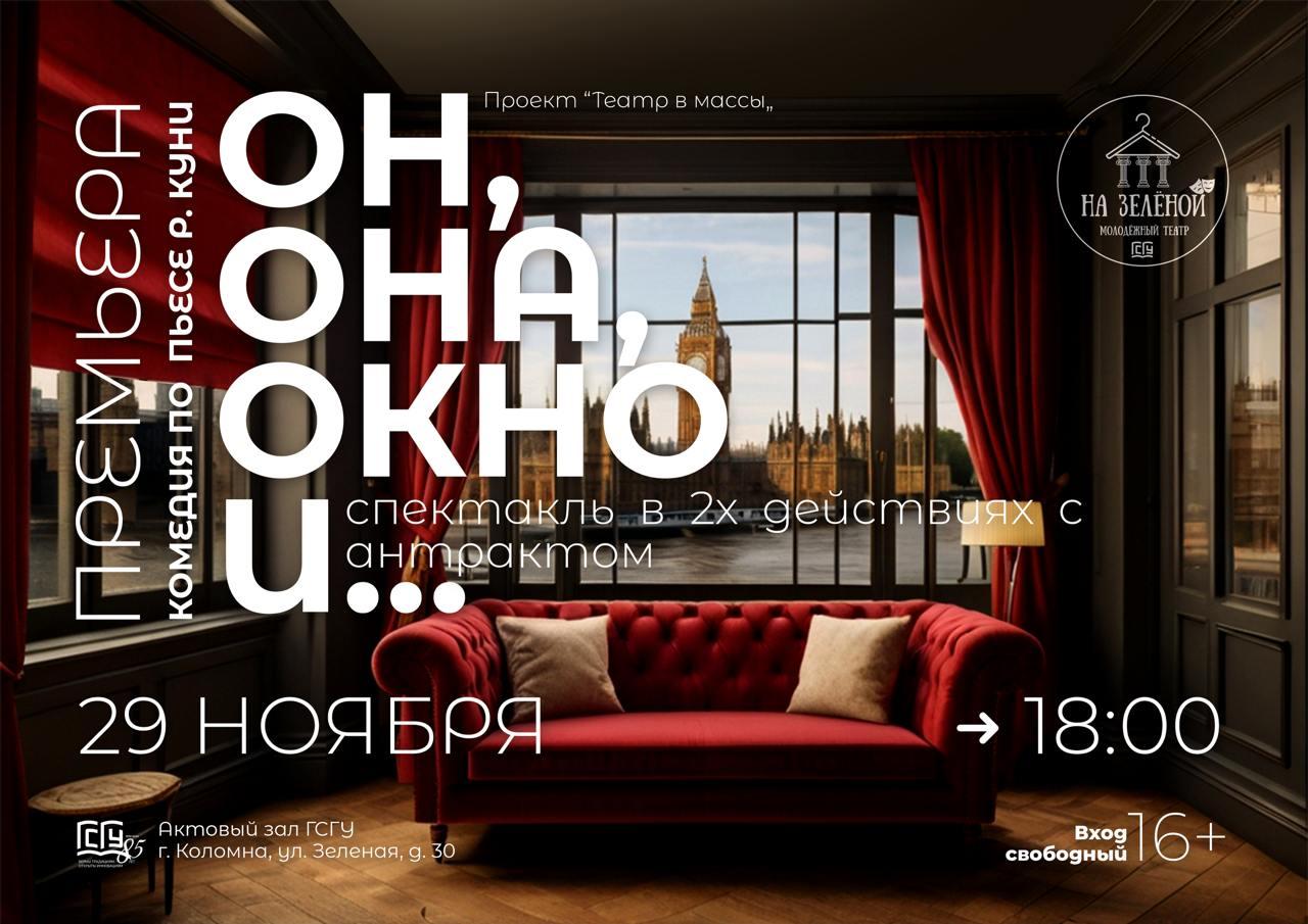 Молодежный театр «На Зеленой», созданный и действующий при Государственном социально-гуманитарном университете, приглашает жителей и гостей Городского округа Коломна на спектакль «Он, она, окно и...». Это - блестящая комедия положений по пьесе знаменитого английского драматурга Рэя Куни.