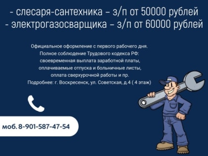 АО «Управляющая организация «Наш Дом – Воскресенск» приглашает на работу слесаря-сантехника (з/п от 50000 рублей) и электрогазосварщика (з/п от 60000 рублей).
